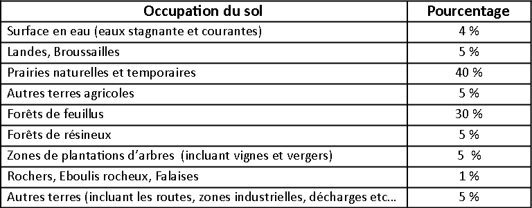 Le Tableau montre bien que ce territoire est caractéristique d’un territoire d’élevage avec plus de 40% de surfaces en herbe et très peu de surface en culture. La description des prairies sera faite en détails dans la partie « contexte agricole »